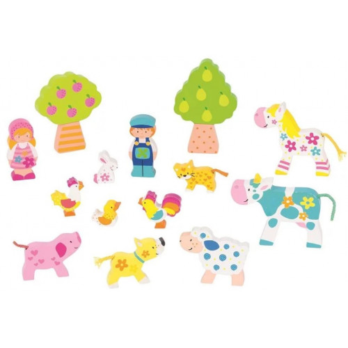 Sada obsahuje 5 figúrok v tvare zvieratiek (mačka, pes, kôň, ovečka a králik) a základňu.