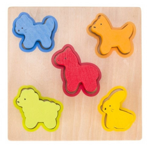 Drevené figúrky zvieratiek v jednoduchých farbách, ktoré sa ľahko skladajú.