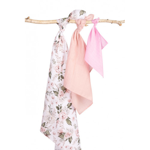 Mušelínové plienky 3 ks - sada rôznych veľkostí - Kvety ružové