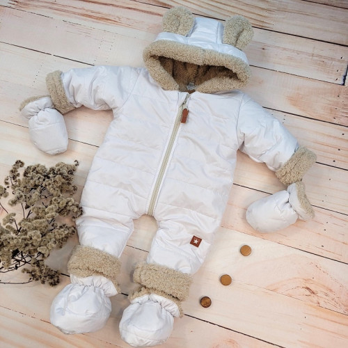 Zimná kombinéza s ozdobným béžovým medvedíkom.